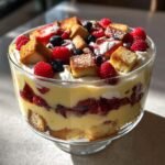 Now for the magic! Start with half your cake cubes in the bottom of a clear trifle bowl (the glass makes it so pretty!). Spoon over half the custard – I use the back of the spoon to spread it evenly right to the edges. Next comes a generous scattering of berries – I alternate colors for maximum festive effect. Repeat these layers once more, then finish with clouds of whipped cream swirled on top. Pro tip: leave some berries aside to decorate the top for that perfect holiday finish!